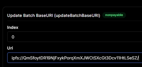 Now you have both the batch ID (zero) and the new batch base URI, you can go back to the Dashboard Explorer, enter the two parameters, and hit Execute. That new names for the NFTs should be reflected in a short while.